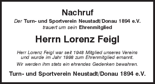 Der TSV trauert um Herrn Lorenz Feigl, verstorben am 26.05.2015